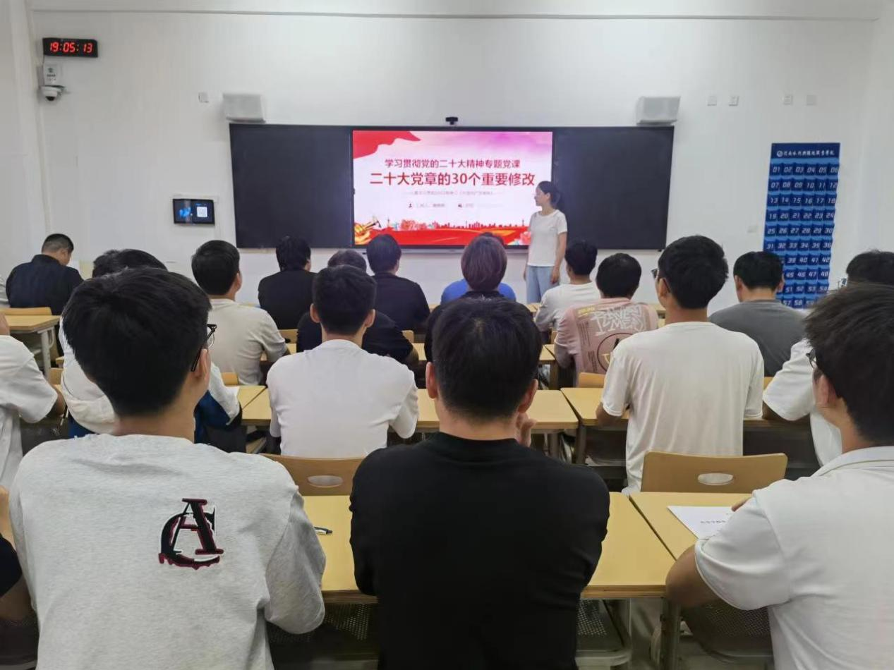 蒋婷婷简要概述了《中国共产党章程》的主要内容,讲解了中国共产党第二十次全国代表大会通过《中国共产党章程(修正案)》的背景和目的,并详细介绍了《中国共产党章程(修正案)》的修订内容及其重大意义。她强调,要深刻领会二十大党章修正案的重大意义与重要内容,认真学习党章,自觉加强党性修养,切实维护好党章的严肃性和权威性,为全面建成社会主义现代化强国贡献青春力量。
