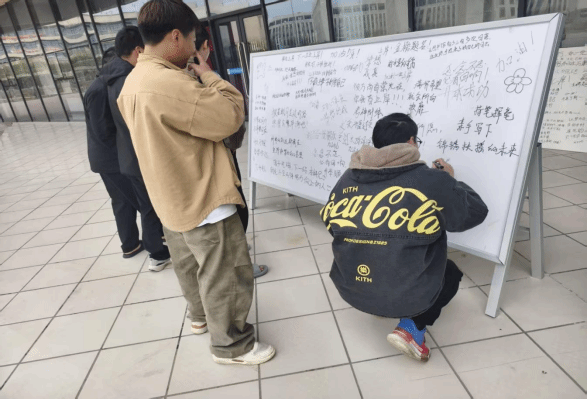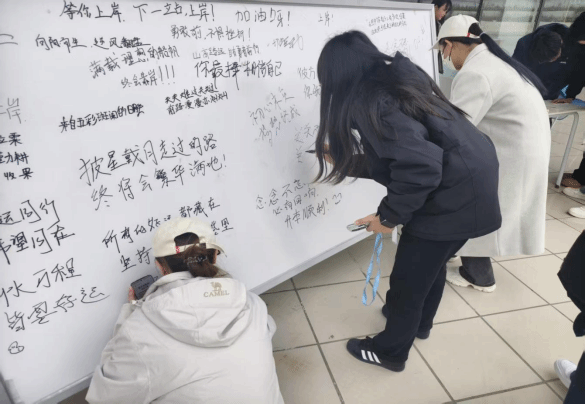 活动以板报寄语形式,为考生注入精神动力。同学们热情高涨,在板报上书写真挚话语,绘制笑脸、加油手势等充满正能量的图案,帮助备考同学缓解紧张情绪。
