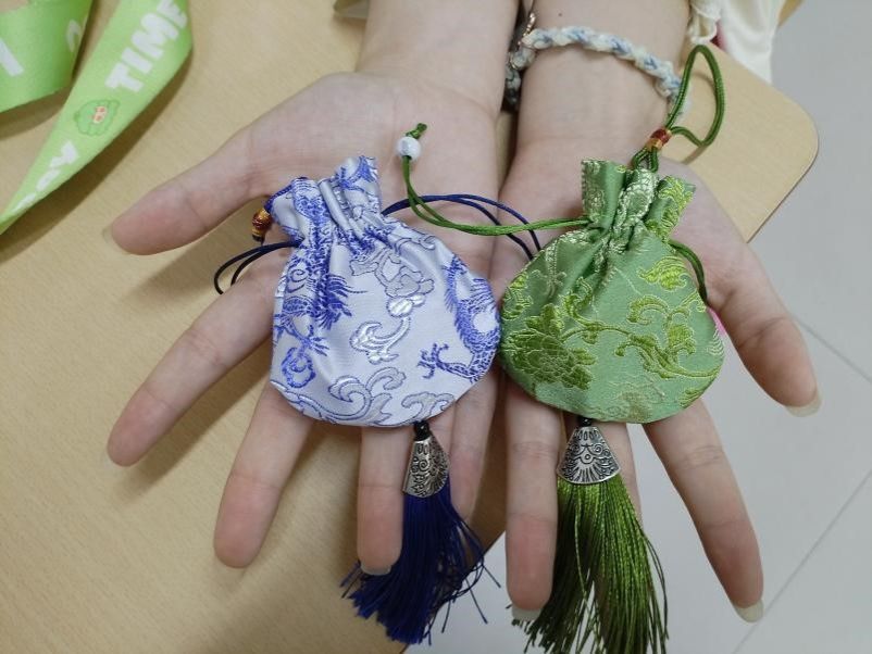 心理健康部志愿者精心筹备,提前准备好制作香囊所需的布料、香料、填充物,以及制作彩绳的彩线等材料,并配备了剪刀、尺子、胶水、笔等工具。活动现场,学生们热情高涨。在制作香囊环节,大家充分发挥动手能力,根据自己的自主想法裁剪布料、缝制香囊。有的学生在香囊上缝制出可爱的卡通图案,有的添加了精美的流苏、珠子等装饰,个性十足的香囊在学生们手中诞生。同时,制作五彩绳的过程同样精彩纷呈。学生们凭借创意,将五彩线交织缠绕,编织出属于自己独一无二的五彩绳,每一根都承载着独特的设计与巧思。