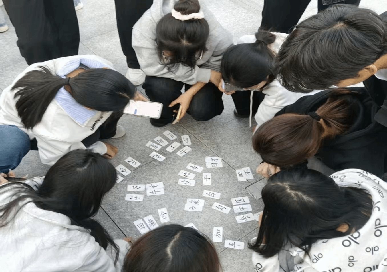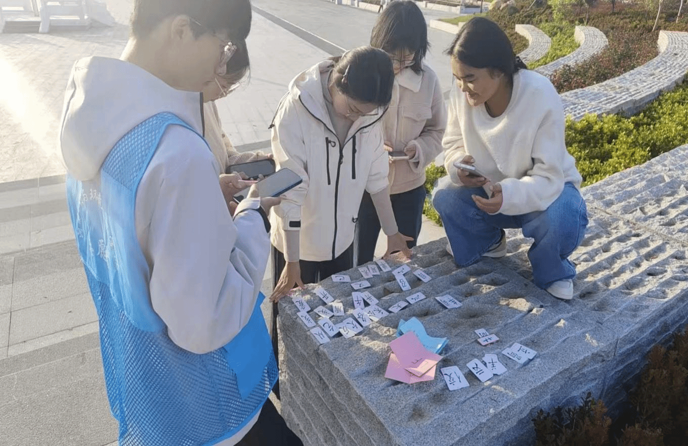 活动伊始,参与同学有序完成签到,并通过随机分组或自由组队的方式,形成3至5人的合作小组。各小组领取专属“寻宝任务卡”后,依照指引在校园指定区域内展开“汉字卡片”搜寻。每张卡片印有一个常用汉字,作为后续拼字环节的基础素材。同学们热情高涨,在校园的各个角落细致探寻,分工明确、配合默契,现场气氛活跃而有序。