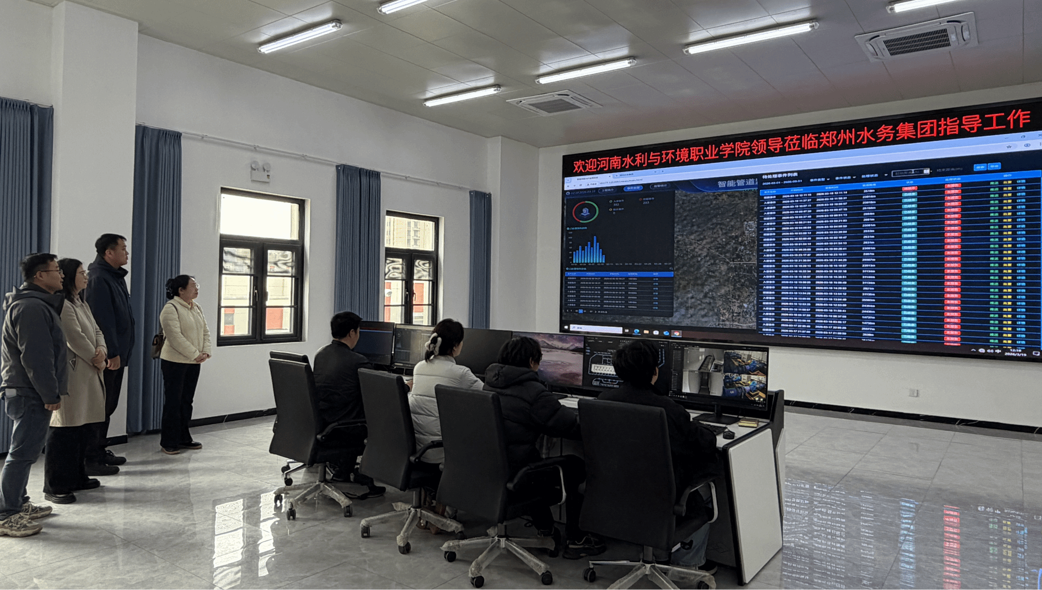 在调度中心,师生代表团深入了解了郑州水务集团有限公司“供水一体化、一张网”战略部署的推进情况,现场感受了智慧水务系统在供水调度、水质监测、管网运维等方面的智能化应用,并近距离观摩了智慧调度系统、自动化监控系统、数据分析与预警系统的运行流程。邢芳对郑州水务集团以科技赋能水务发展的创新实践给予高度评价,认为其在推动水务现代化建设方面成效显著、示范性强,同时表示,此次参观交流对职业教育教学发展方向具有重要启发意义,为专业人才培养提供了鲜活的实践案例与宝贵的行业认知。